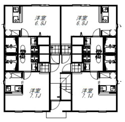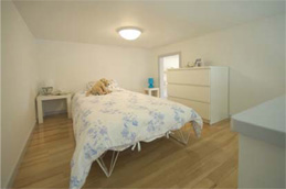 壱番館では、一戸あたりの専有面積を16m2しか取れなかったのですが、参番館は専有面積を22m2まで広げました。22m2にしたのには訳があります。計画地のある横須賀市では建物の延床面積を200m2以下にし、かつ建物を45分準耐火構造にすれば、市の建築基準条例で集合住宅に求められる2方向の避難通路の確保、2階部屋からの避難機具の設置が必要ないのです。全体の面積を200m2以内に抑えるには、プリマは2階建てなので、各階の面積は100m2以下となります。その内、プリマは玄関、階段、廊下の共用部の面積が合計で約12m2あり、残った面積を各階の戸数4で割れば、100-12=88÷4=22m2となるのです。その限界まで各戸の専有面積を広げました。そして建築基準法で許容されるロフト面積は専有面積の2分の1まで、ロフトの面積は最大で11m2です。22+11=33m2、賃貸マンションにある1LDKの専有面積は30~35m2なので、今回のプランはロフトを寝室として使えば、単身者が住むには余裕のある広さです。賃貸物件を探す際に、寝室と居室を別にできる1LDKを希望する人は多くいるのですが、実際には1LDKは物件自体が少ないことと、仮にあったとしても、家賃が高く、予算に合わず、そこに住めない人が多くいるのです。参番館は本来であれば、1LDKの間取りを希望する女性の単身者まで入居者の募集範囲を広げました。
