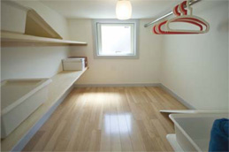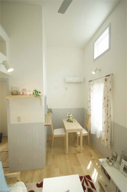 間取り的には壱番館ではやむなく諦めた物入れが参番館ではしっかり取れました。更に、11m2あるロフト面積の3m2分をウォークインクロゼットにしました。ロフトにあるとはいえ、普段使わないもの、季節物の衣類等を収納するにはとても便利です。収納スペースの充実も、物件選択の際の重要ポイントのひとつです。このウォークインクロゼットは予想外に好評でした。もともとロフト自体が居室にサービスで付随する空間なのですが、その奥にウォークインクロゼットまであるのです。入居者はおまけに更におまけが付いているような得をした気分になります。LDKは合わせて約9畳、ダイニングテーブルと椅子が2脚、二人掛けのソファーとコーヒーテーブル、ローボードが無理なく置けるスペースです。専有面積を22m2に抑え、LDKで9畳の広さを確保するのは、通常のアパートプランでは不可能です。しかし、プリマでは可能です。何故可能なのか、それはプリマには部屋の専有部分には廊下がない、あったとしても最低限にしかないからです。建物中央に各室の玄関を配置するプリマの設計構想が22m2の物件でLDK9畳を可能にしたのです。プレハブの片廊下型アパートでは絶対にできない技です。