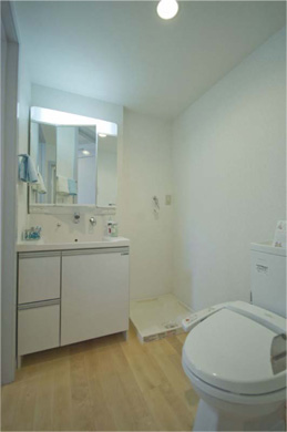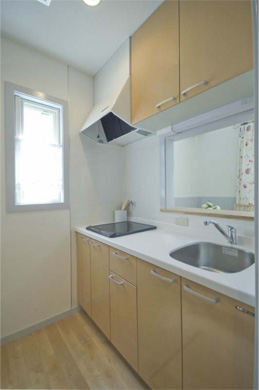 次に、改良を図ったのは設備です。壱番館のキッチンはスペースに余裕がなく、冷蔵庫付きのミニキッチンだったのですが、入居者の評判が芳しくありませんでした。参番館では2口IHコンロ付き、人工大理石カウンターのシステムキッチンを導入しました。そしてキッチンスペースを居室から独立させ、ダイニングと対面で配置しました。以前は主婦の憧れだった対面キッチンです。対面キッチンは今では注文住宅、分譲住宅で一般化しましたが、アパートではまだまた少なく、単身者用の物件では稀にしかありません。これで、参番館はキッチンで他の物件と大きな差別化が図れます。キッチンは女性が物件を選ぶ際に、セキュリティーと共に最も重視するポイントです。居室が広いほうがいいとか、単身者がいったい誰と対面するのか?という関係者の真っ当な意見もありましたが、妻に相談したところ、妻は大いに賛成で、対面キッチンの導入が決まりました。キッチン以外では、壱番館の洗面台はユニットバスの中にありましたが、参番館ではトイレを兼ねた脱衣室に独立のシャンプードレッサーを設置しました。便器には洗浄便座を付けました。